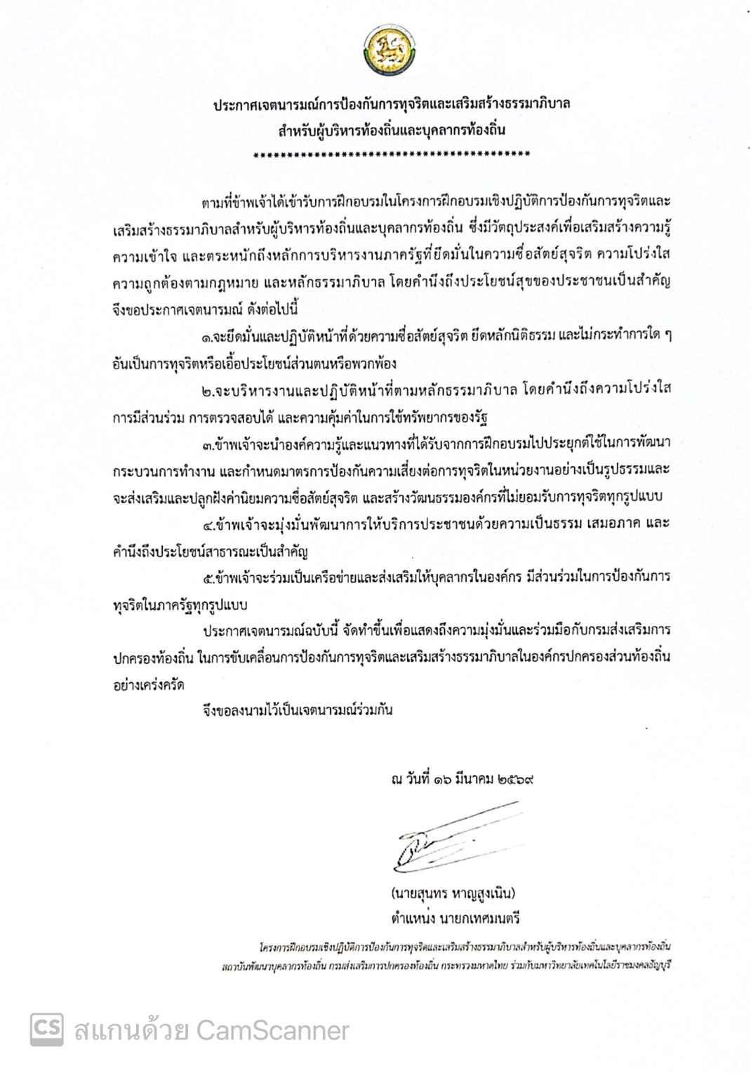 ประกาศเจตนารมณ์การป้องกันการทุจริตและเสริมสร้างธรรมาภิบาลสำหรับผู้บริหารท้องถิ่นและบุคลากรท้องถิ่น |
