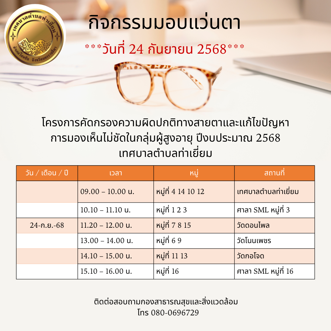 ประชาสัมพันธ์กิจกรรมมอบแว่นตา แจ้งจากกองสาธารณสุขและสิ่งแวดล้อมเทศบาลตำบลท่าเยี่ยม ในวันที่ 24 กันยายน 2568 ตามโครงการคัดกรองความผิดปกติทางสายตาและแก้ไขปัญหาการมองเห็นไม่ชัดในกลุ่มผู้สูงอายุ เวลาและสถานที่ตามกำหนดการที่แนบมานี้ |