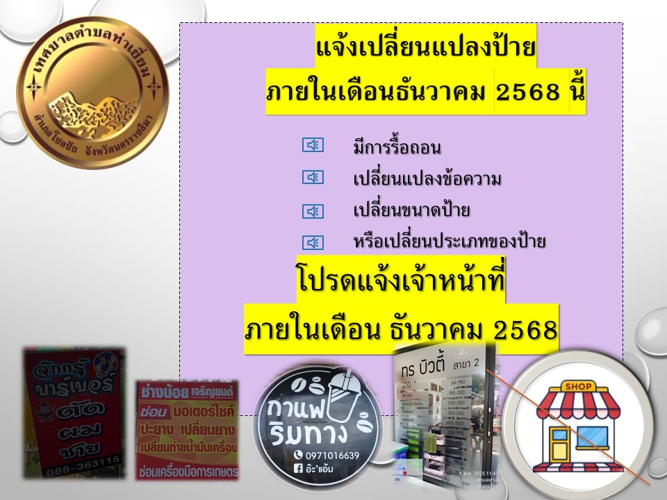 ประชาสัมพันธ์งานพัฒนารายได้ กองคลัง เทศบาลตำบลท่าเยี่ยม . -#ป้ายรื้อถอนหรือเปลี่ยนแปลง สำหรับกิจการที่ติดตั้งป้ายและเสียภาษีป้ายแล้ว หากมีการเปลี่ยนแปลงประเภทป้าย ขนาดป้าย จำนวนด้านเพิ่มหรือลดจำนวนป้าย หรือสถานที่ติดตั้งป้าย ที่ทำการเปลี่ยนแปลง ขอให้แจ้งเทศบาลตำบลท่าเยี่ยม #ภายในเดือนธันวาคม2568นี้ |