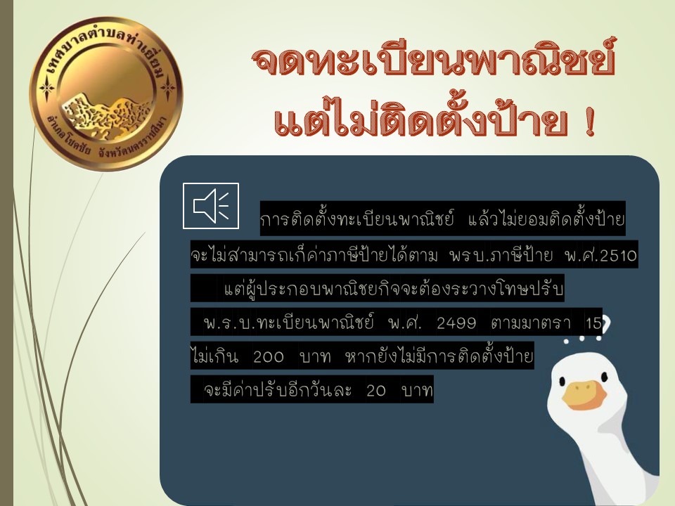 ประชาสัมพันธ์งานพัฒนารายได้ กองคลัง เทศบาลตำบลท่าเยี่ยม . - การจดทะเบียนพาณิชย์แล้วไม่ติดตั้งป้าย จะไม่สามารถเก็บค่าภาษีป้ายได้ตาม พรบ.ภาษีป้าย พ.ศ. 2510 แต่ผู้ประกอบพาณิชยกิจจะมีความผิดทางพินัย ต้องชำระค่าปรับเป็นพินัยไม่เกิน 200 บาท หากยังไม่มีการติดตั้งป้าย จะมีค่าปรับฯ อีกวันละ 20 บาท ตาม พรบ.ท |