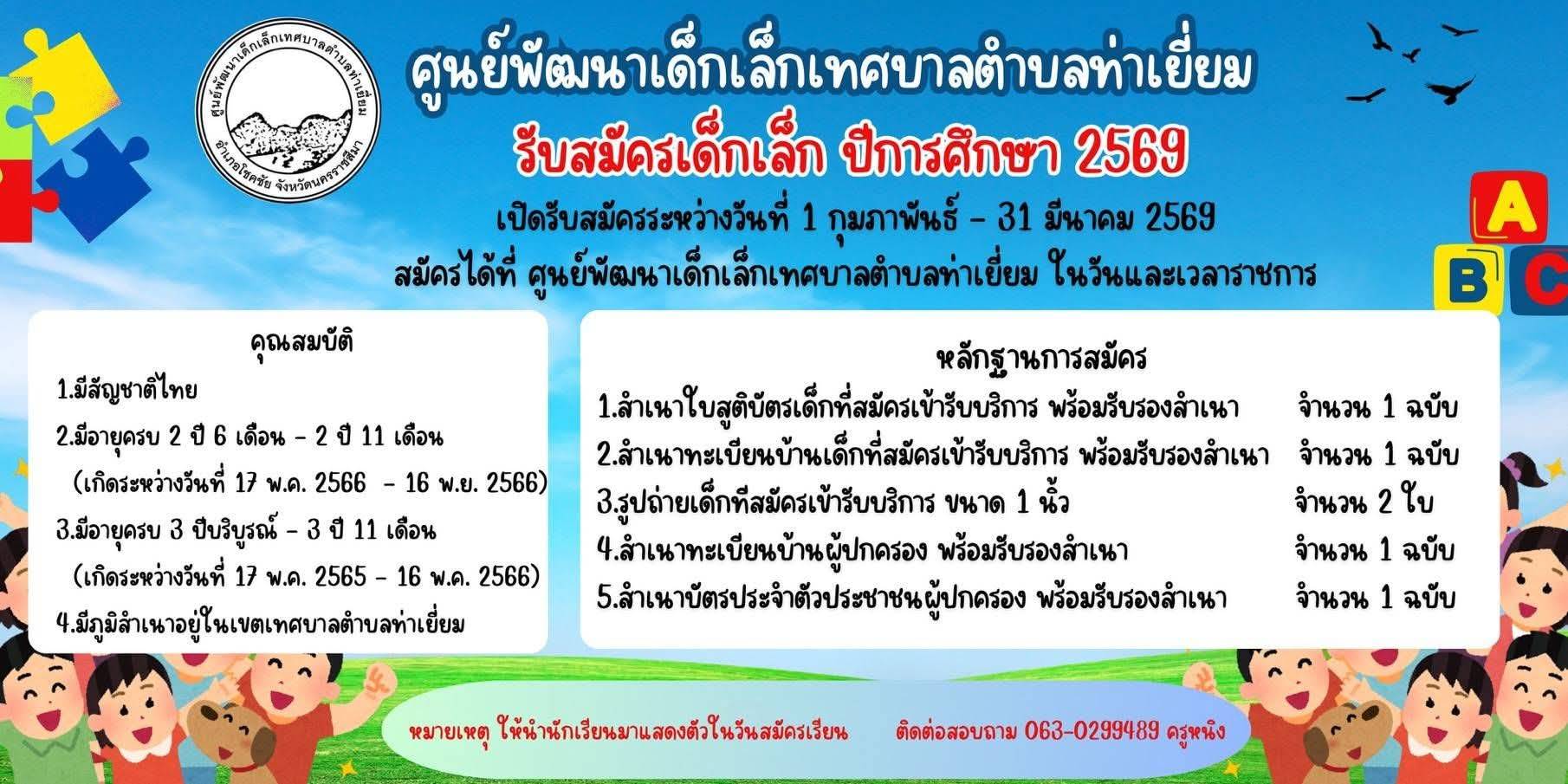 📢 ประกาศ 📢 เรื่อง รับสมัครเด็กเข้าเรียนเข้าใหม่ ประจำปีการศึกษา 2569 กำหนดการรับสมัคร วันที่ 1 ก.พ.- 31 มี.ค. 2569 ติดต่อขอรับใบสมัครได้ตั้งแต่บัดนี้ และยื่นใบสมัครได้ในวันที่ 1 ก.พ - 31 มี.ค. พ.ศ.2569 ณ ศูนย์พัฒนาเด็กเล็กเทศบาลตำบลท่าเยี่ยม ในวันและเวลาราชการ ตั้งแต่ 08.30-16.3