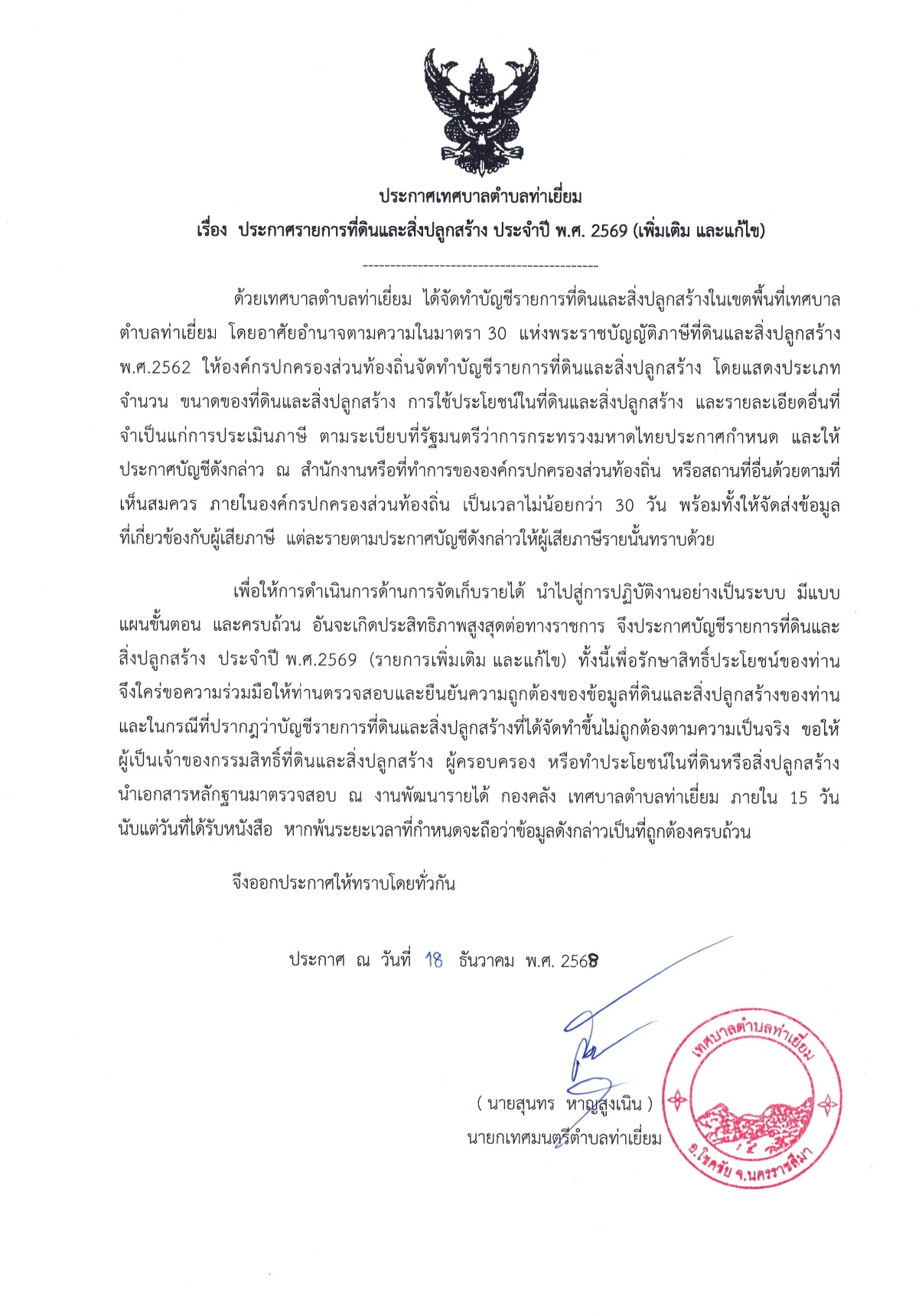 ประกาศบัญชีรายการที่ดินและสิ่งปลูกสร้าง ภ.ด.ส.3 ประจำปี พ.ศ.2569