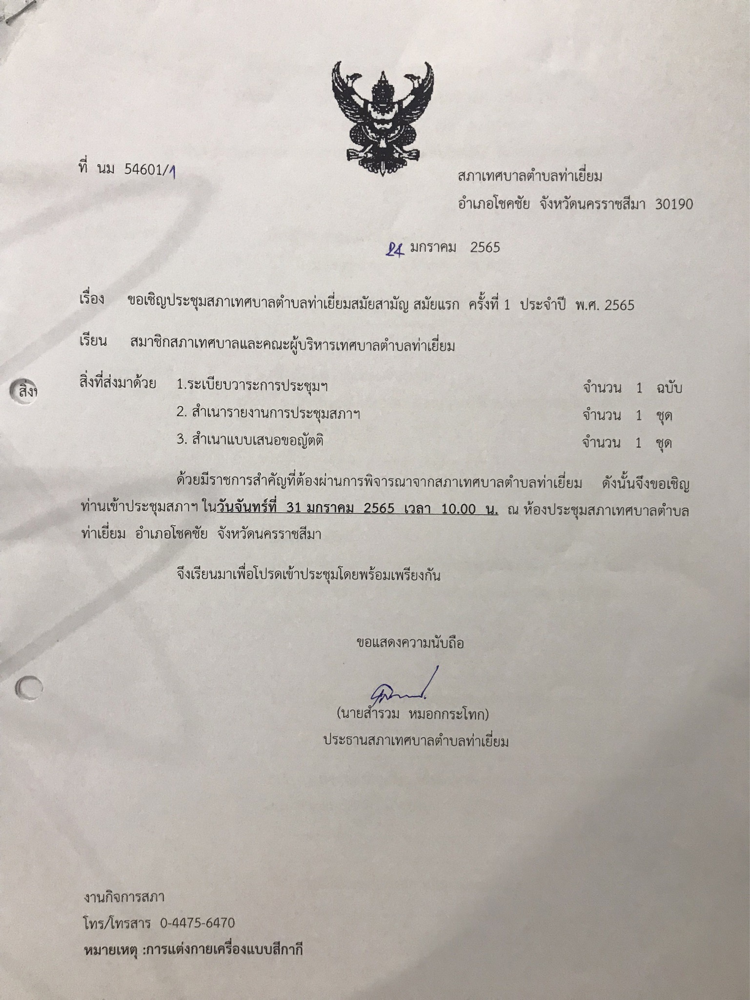 หนังสือนัดประชุมสภาเทศบาลตำบลท่าเยี่ยม สมัยสามัญ สมัยที่ 1 ประจำปี 2568 |